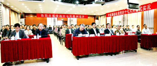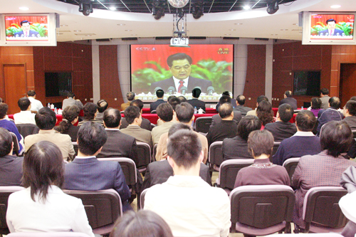 雖然因?yàn)槿藛T太多而略顯擁擠,但整個(gè)會(huì)場卻非常安靜,就連每逢會(huì)議難免嗡嗡作響的手機(jī)似乎也絕了聲。大家都在認(rèn)真地傾聽,有的詳細(xì)地做著記錄,有的還時(shí)不時(shí)地將身子輕輕探起,生怕錯(cuò)過電視里傳出的只言片語……10月15日上午,中核集團(tuán)公司黨組成員、副總經(jīng)理孫又奇,黨組成員王森,以及老領(lǐng)導(dǎo)趙宏、李忠良、錢福源等與集團(tuán)公司總部、檔案館、金原鈾業(yè)公司、新聞宣傳中心、二二一局的干部職工一起收看了中共十七大開幕式的現(xiàn)場直播,聆聽了胡錦濤總書記所作的報(bào)告。